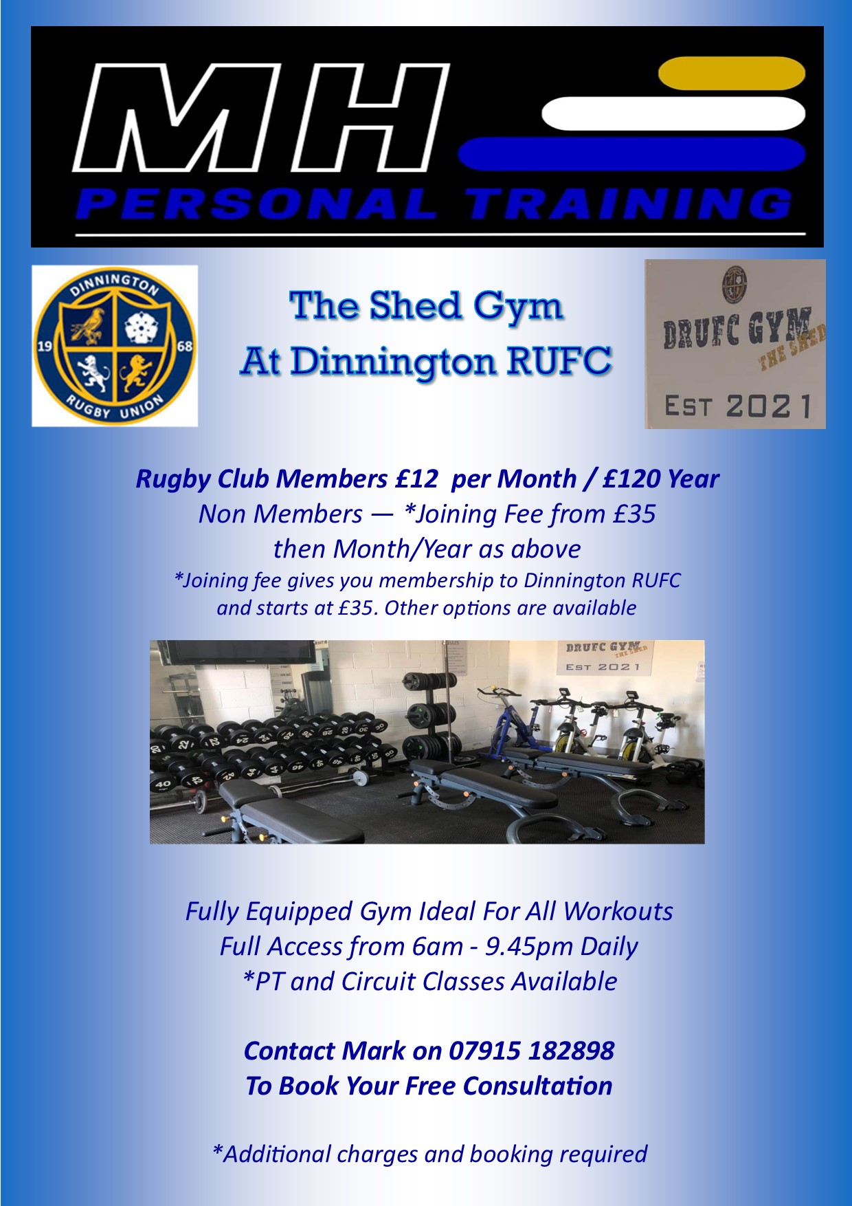 The gym is located onsite at Dinnington RUFC, please message Matthew Starr, Pete Hill, Tyle Stimpson or Mark Harrison for more information on how to sign up.